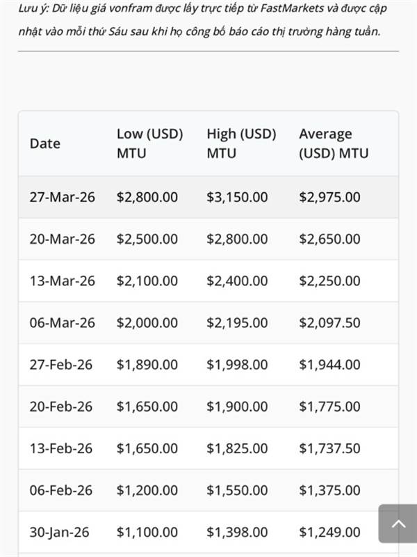 Giá Vonfram APT (20-27/3) do Fastmarkets ghi nhận Vonfram APT 88,5% WO3 tối thiểu cif Rotterdam và Baltimore miễn thuế, tăng +12,26% trong tuần với giá $2.800-3.150/mtu WO3. Giá trung bình 2975 usd/mt...Thêm