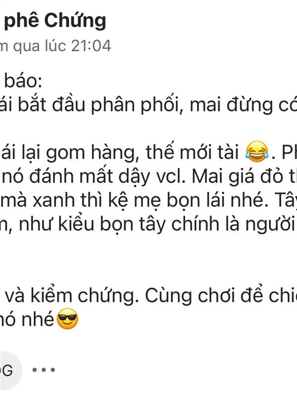 Mé nó đạp đỏ hnay sợ ko giám múc hết tiền mới đau. Chứ nó đưa tin có tiền góp vốn 4 cty mới thì múc kịch trần luôn rồi.