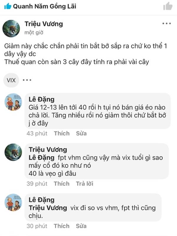 Hôm thuế quan vix giá 10, hcm giá hiện tại 23,5 , hiện tại vix 30 có lúc 40 hcm 23,65 thế mà chúng nó vẫn nói đánh giống vix đc 🤣🤣🤣t đến cười chết