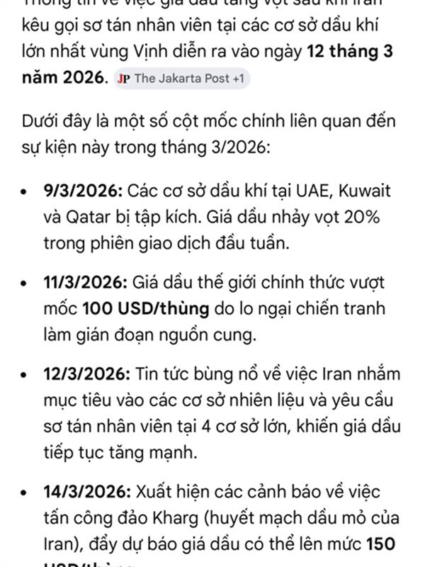 Giá dầu tăng vọt khi Iran kêu gọi công dân,nhân viên trong và gần 4 cơ sở dầu mỏ,khí đốt lớn nhất vùng Vịnh sơ tán ngay lập tức