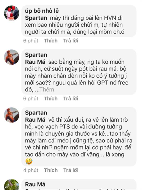 Spartan mày thì đăng bài lên HVN đi xem bao nhiêu người chửi m, tự nhiên người ta chửi m à, đúng loại mõm ch.ó