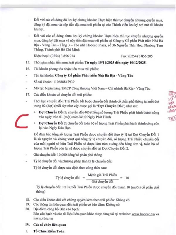 phong nguyen hoang vâng bạn, chia làm 2 lần chuyển đổi . Thí dụ tôi có 10.000 cp Hdc , thì được mua tầm 340 trái phiếu hdc( 34 triệu), sau năm 1 được chuyển đổi 40%*340= 1360 cp hdc , năm 2 được chuyển đổi 2120 cp hdc ....Thêm