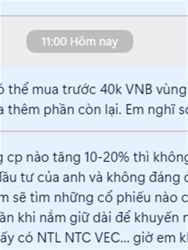 Những cp nào tăng 10-20% thì không phù hợp với phong cách đầu tư của anh và không đáng để khuyến nghị cho anh. Em sẽ tìm những cổ phiếu nào có tiềm năng tăng bằng lần khi nắm giữ dài để khuyến nghị ch...Thêm