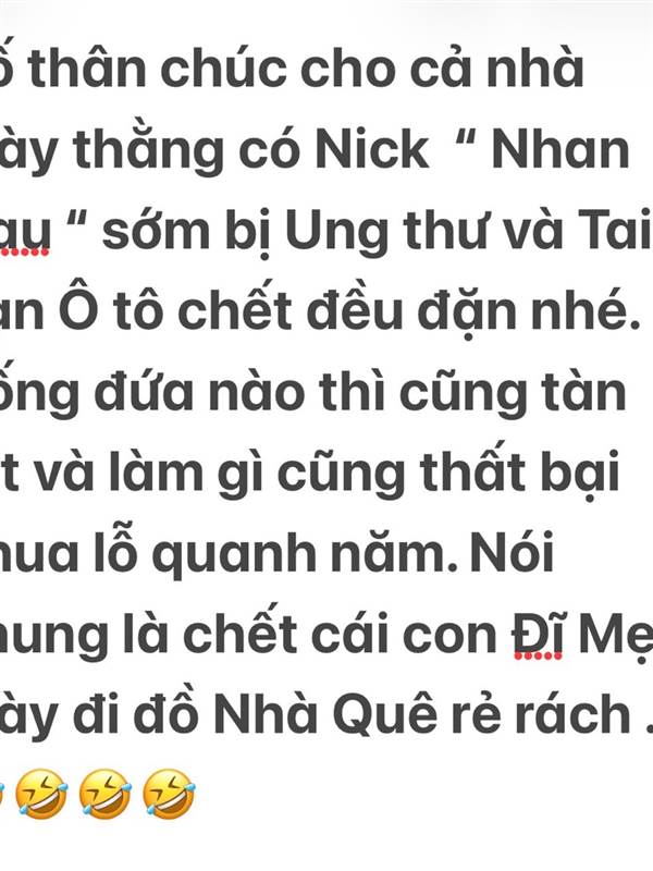 Lúc nào con Đ ĩ m ẹ mày nó bị ô tô cán chít và mày bị tai n ạn thì ngớ báo tao nhé thằng Nh à Qu ê . Bố sẽ gửi cho vài đồng để chúng mày mang nhau đi ch ôn