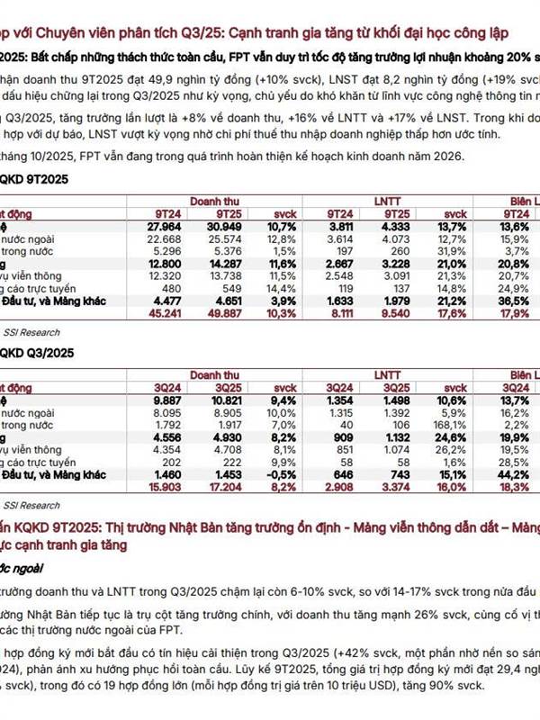 Kết quả kinh doanh 9 tháng đầu năm 2025 của FPT (Nguồn: SSI Reseach)