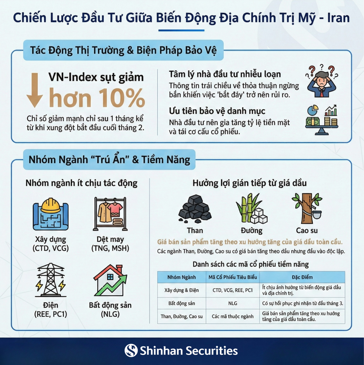 - Ngành Xây dựng (CTD, VCG): Tập trung vào nhu cầu nội địa và các dự án đầu tư công, ít nhạy cảm với chi phí vận hành biến động theo giá dầu.