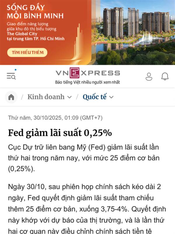 Lãi suất quỹ liên bang: Giảm 0,25%, từ mức 4,00 – 4,25% xuống 3,75 – 4,00%.