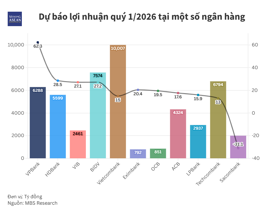 Theo MBS, VPBank có thể đạt lợi nhuận sau thuế quý 1/2026 khoảng 6.388 tỷ đồng, tăng 62,3% so với cùng kỳ và hoàn thành khoảng 20% kế hoạch năm. Dư nợ tín dụng ước tăng 7,5%, cao hơn mặt bằng chung toàn ngành trong bối cảnh tăng trưởng tín dụng bị kiểm soát.