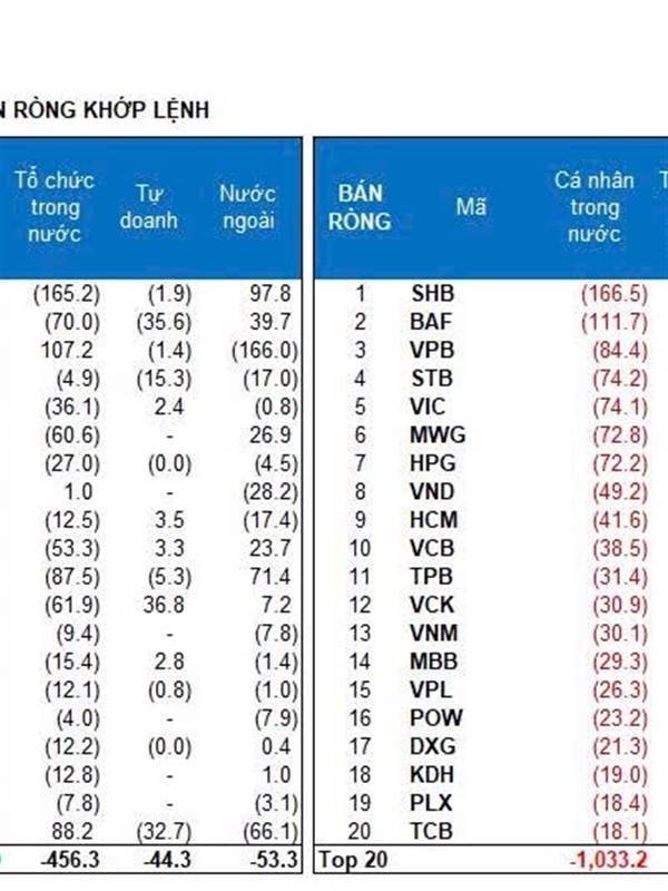 Riêng CP khớp lệnh : TỰ DOANH BÁN RÒNG : -162.3 tỷ đồng