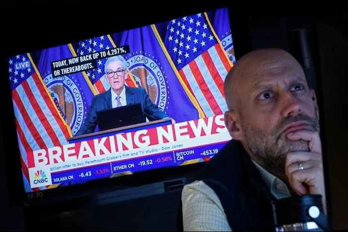 Một nhà giao dịch trên sàn chứng khoán New York lắng nghe cuộc họp báo của Chủ tịch Cục Dự trữ Liên bang Mỹ (Fed) Jerome Powell.(Ảnh: Reuters).