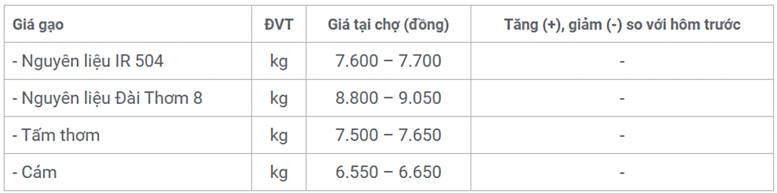 Cụ thể, giá gạo nguyên liệu IR 504 tiếp tục được giao dịch ở mức 7.600 – 7.700 đồng/kg; gạo nguyên liệu Đài Thơm 8 dao động trong khoảng 8.800 – 9.050 đồng/kg.