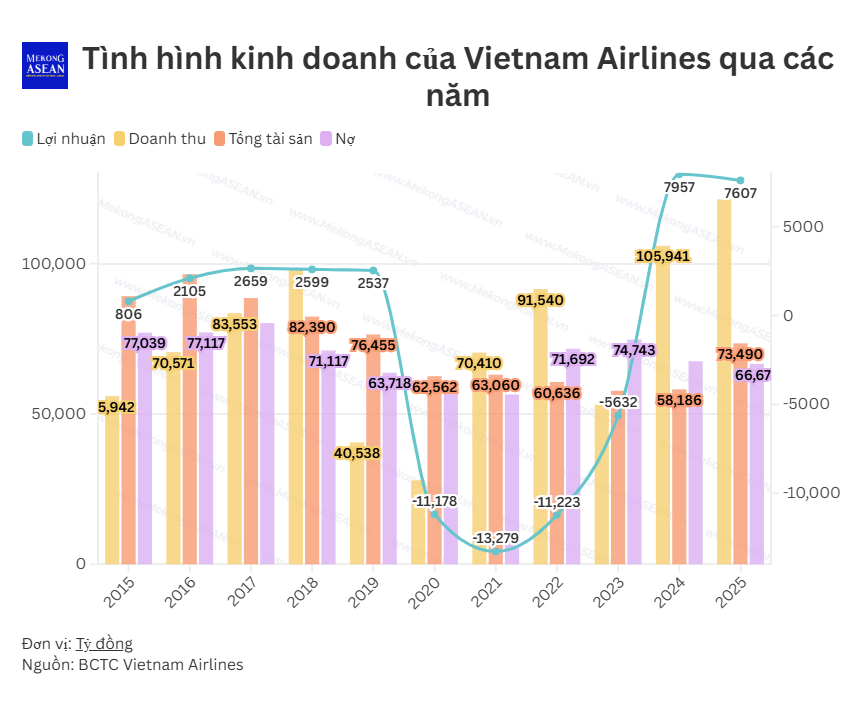 Đến cuối năm 2025, Vietnam Airlines đã giảm lỗ lũy kế xuống còn 26.685 tỷ đồng (so với mức lỗ 33.614 tỷ đồng hồi đầu năm). Nhờ kết quả kinh doanh khả quan và việc tăng vốn góp chủ sở hữu lên 31.114 tỷ đồng, vốn chủ sở hữu của hãng đã thoát khỏi tình trạng âm, đạt 6.729 tỷ đồng tại thời điểm cuối năm 2025.