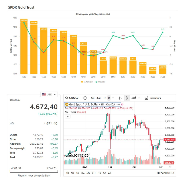 Sau 2 phiên liên tiếp bán ròng, quỹ này đã đảo chiều gom hàng khi giá vàng bật tăng mạnh. Theo Kitco, giá vàng thế giới đóng cửa phiên 31/3 tại mốc 4.668 USD/oz, tương ứng tăng 3,5% so với phiên trước. Thậm chí trong phiên, có lúc giá vàng giao ngay tiến sát ngưỡng 4.690 USD/oz, mức cao nhất kể từ hôm 20/3.
