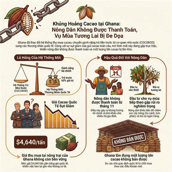 🌏 Ở Ghana, quốc gia sản xuất cacao lớn thứ hai thế giới, đang có một vở kịch không hề "ngọt ngào". Nhiều nông dân đang méo mặt vì không được trả tiền cho số cacao họ đã bán từ tháng 11, trong khi kho...Thêm