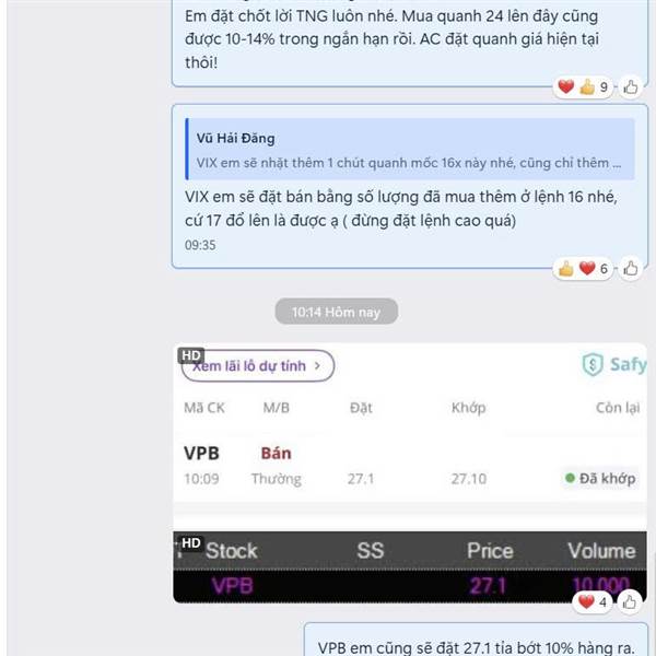 Các lệnh sáng nay BÁN TNG => BÁN VIX => BÁN VPB. Xử lý triệt để các lệnh mua thêm - margin - sức mua ac nhé. Xanh như này là thời điểm ko thể tốt hơn rồi