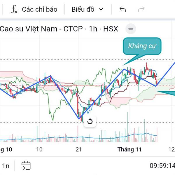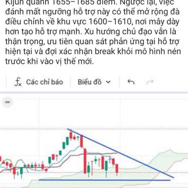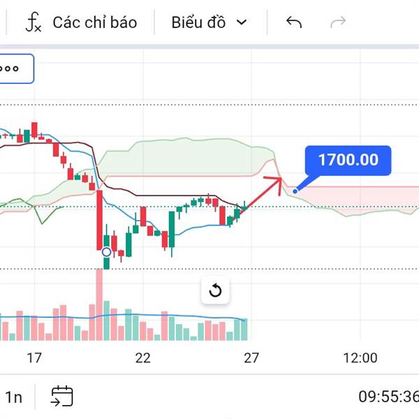 Quan sát đồ thị Ichimoku, VN-Index hiện đang bật tăng trở lại khi chạm vùng hỗ trợ của mây Kumo – cho thấy lực đỡ ngắn hạn vẫn khá tốt. Mây Kumo bên dưới có độ dày vừa phải, đóng vai trò như vùng hỗ t...Thêm