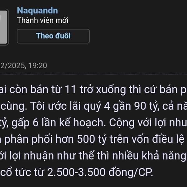 Tôi ước lãi quý 4 gần 90 tỷ, cả năm 245 tỷ, gấp 6 lần kế hoạch. Cộng với lợi nhuận chưa phân phối hơn 500 tỷ trên vốn điều lệ 710 tỷ. Với lợi nhuận như thế thì nhiều khả năng sẽ chia cổ tức từ 2.500-3...Thêm