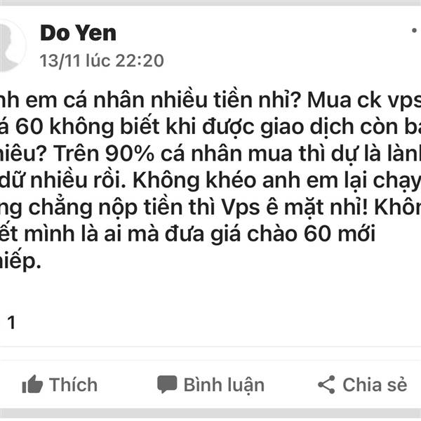 Anh em cá nhân nhiều tiền nhỉ? Mua ck vps giá 60 không biết khi được giao dịch còn bao nhiêu? Trên 90% cá nhân mua thì dự là lành ít dữ nhiều rồi. Không khéo anh em lại chạy làng chẳng nộp tiền thì Vp...Thêm