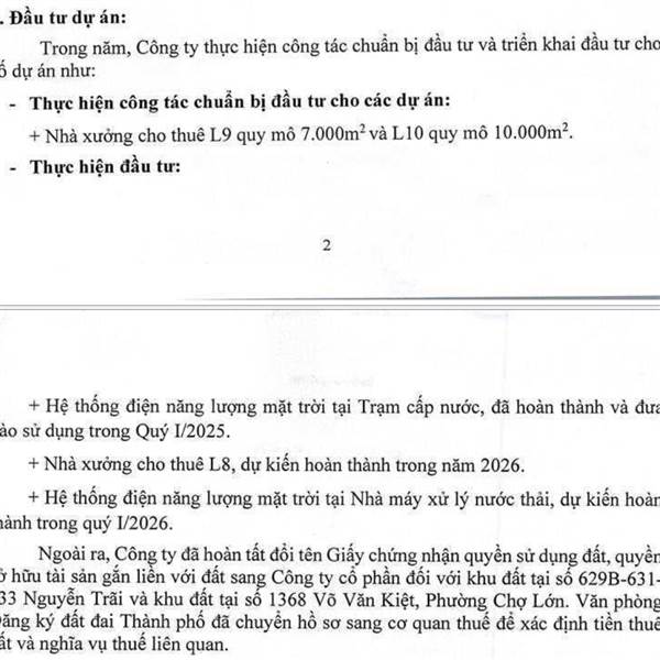 năm nay ngoài dự án cao ốc sẽ triển khai ra còn có nhà xưởng L8 sẽ hoàn thành, thêm 2 nhà xưởng L9, L10 nữa đang triển khai, sắp tới sẽ có thêm khoảng 12000m2 nhà xưởng cho thuê với đơn giá 5 usd/thán...Thêm