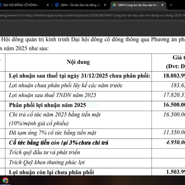 GMH dự kiến tiếp tục chia cổ tức 3%, nâng mức cổ tức năm nay lên 10%. Năm 2026 dự kiến tiếp tục giữ cổ tức 10%. Qúa ngon cho một em hàng giá chưa đến 8K. tiền tươi/cp xấp xỉ 7,5k/cp