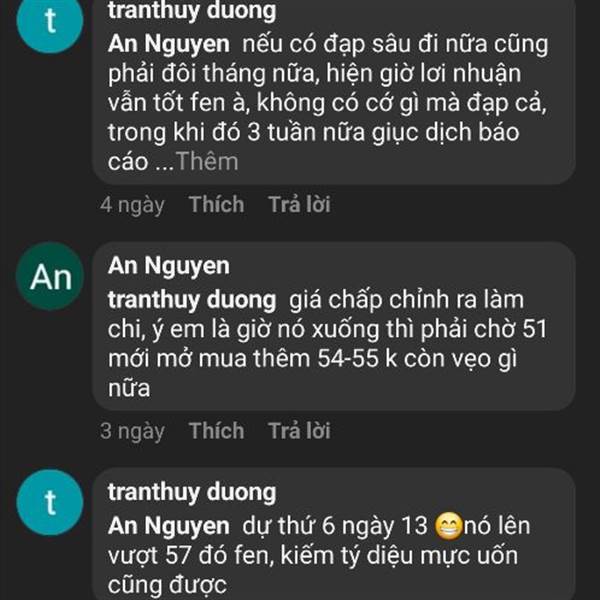Con trai của chú bao giờ về bờ 😆. Mua giá 6x giờ TBG đến chết hả con trai An nguyen 😆. Thằng con trai chắc cay cú quá nên chửi um lên, hồi nhỏ ko cho nó ăn học tới nơi tới chốn nên giờ thua lỗ 30% t...Thêm