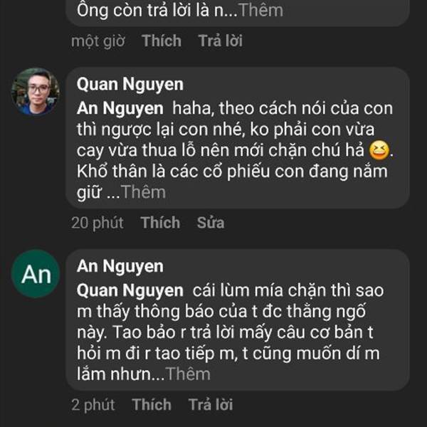 Khổ thân thằng con trai, nói là chặn nhưng vẫn lén mở ra xem cmt😁. Sống dơ nhu chuột thì sao khá lên đc hả con ơi 😆. Con đu HAH, ACV lỗ hơn 30% thì giờ trời cứu con rồi 😆