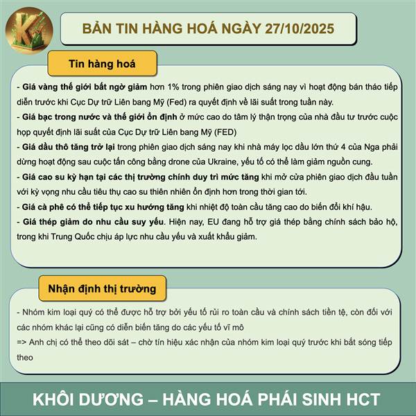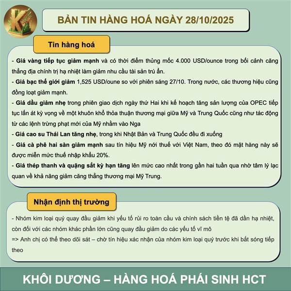 THỊ TRƯỜNG HÀNG HOÁ NGÀY 27/10/2025 - Giá vàng thế giới bất ngờ giảm mạnh: giá vàng thế giới bất ngờ giảm hơn 1% trong phiên giao dịch sáng ngày thứ Hai (27/10) vì hoạt động bán tháo tiếp diễn trước kh...Thêm