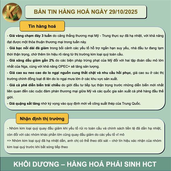 THỊ TRƯỜNG HÀNG HOÁ NGÀY 29/10/2025 - Giá vàng chạm đáy 3 tuần: căng thẳng thương mại Mỹ - Trung thực sự đã hạ nhiệt, với khả năng đạt được một thỏa thuận thương mại trong tuần này. Điều đó được đánh g...Thêm