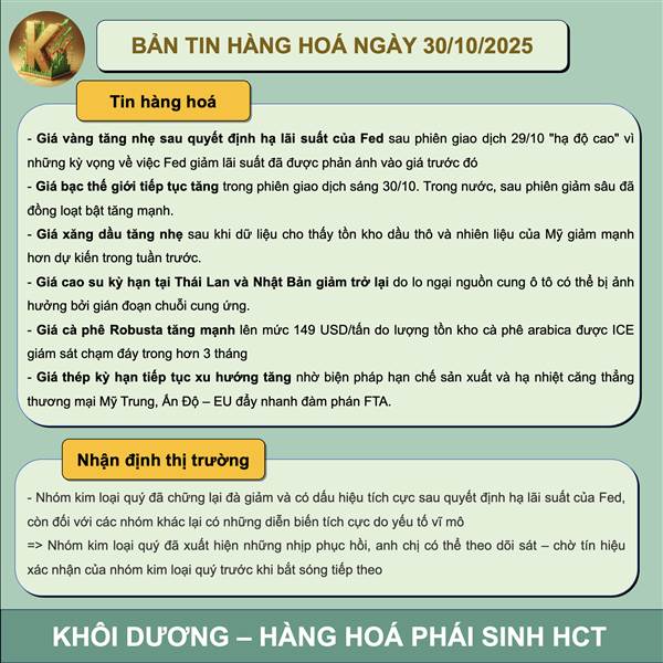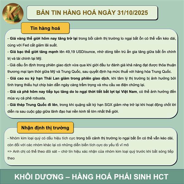 THỊ TRƯỜNG HÀNG HOÁ NGÀY 31/10/2025 - Giá vàng tăng gần 2% vì bất ổn kéo dài: giá vàng thế giới hôm nay tăng trở lại trong bối cảnh thị trường lo ngại bất ổn có thể vẫn kéo dài, cùng với Fed cắt giảm l...Thêm