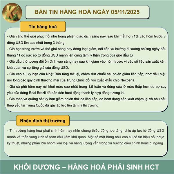 Chiến lược giao dịch sản phẩm Lúa mì T12/2025 ngày 05/11/2025 ______________________ - Nhận định kỹ thuật: ở khung thời gian 4H, lúa mì tạo đà tăng mạnh sau khi giá chạm mốc cản quanh 540. Hiện tại, giá...Thêm