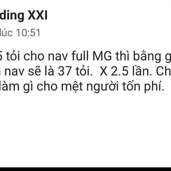 Bỏ ra 11.5 tỏi cho nav full MG thì bằng giờ này sang năm nav sẽ là 37 tỏi. X 2.5 lần. Chạy ra chạy vào làm gì cho mệt người tốn phí.