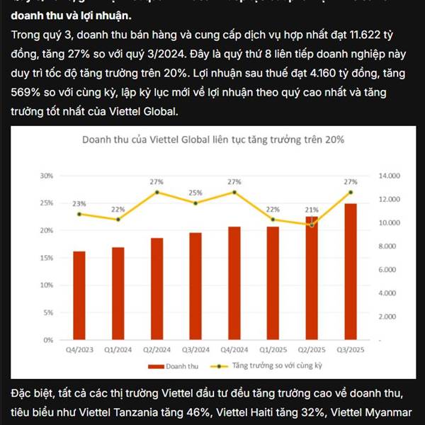 Dựa trên các báo cáo tài chính và tin tức gần đây (tính đến Quý 3/2025): 🚀 Tình hình kinh doanh chung của VGI (Viettel Global) rất khả quan: Tăng trưởng Doanh thu mạnh mẽ: Viettel Global đã ghi nhận tă...Thêm