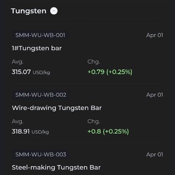 Giá Vonfram 01/04 trên TT Shanghai tiếp tục tăng 0.25%, chính thức quay lại vùng đỉnh cũ.