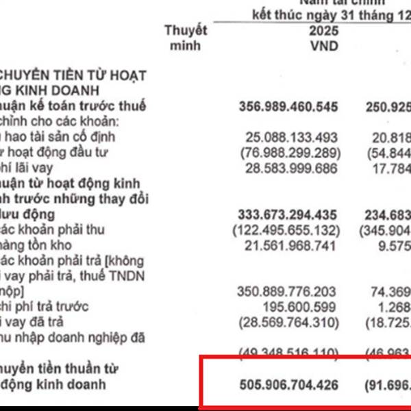 Dòng tiền từ hoạt động kinh doanh: Thặng dư dương hơn 505 tỷ đồng, cho thấy hoạt động cốt lõi tạo ra tiền mặt tốt, mở rộng quy mô đầu tư hạ tầng mạnh mẽ, được hỗ trợ bởi dòng tiền kinh doanh ổn định v...Thêm