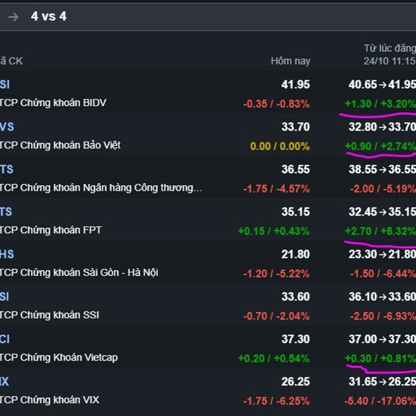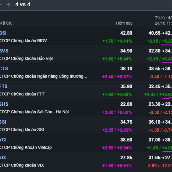 4 vs 4 Tính tới hết phiên sáng Dòng giảm về đáy thuế quan (FTS BSI VCI BVS) đang tạm thời dẫn trước 1-0 so với dòng tạo nền giá trên đỉnh (VIX SHS SSI CTS)