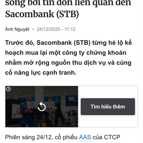 Trước đó, Sacombank (STB) từng hé lộ kế hoạch mua lại một công ty chứng khoán nhằm mở rộng nguồn thu dịch vụ và củng cố năng lực cạnh tranh.