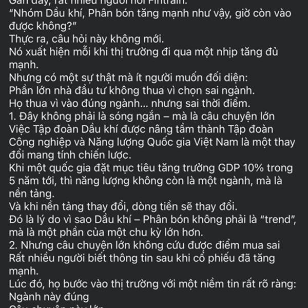 Nếu dựa vào giá OIL đánh dòng dầu khí, phân bón thuộc tập đoàn công nghiệp và năng lượng quốc gia Việt Nam thì quá thiển cận và đọc sai câu chuyện lớn! Ace tham khảo bào viết trên facebook hoặc tiktok ...Thêm