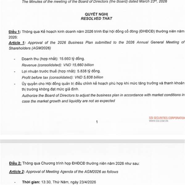 SSI kế hoạch 2026 15660 tỷ DT lợi nhuận 5838 tỷ