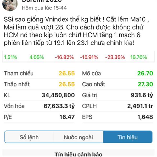 SSi sao giống Vnindex thế kg biết ! Cắt lêm Ma10 , Mai làm quả vượt 28. Cho oách được không chứ HCM nó theo kịp luôn chừ! HCM tăng 1 mạch 6 phiên liên tiếp từ 19.1 lên 23.1 chưa chỉnh kìa!
