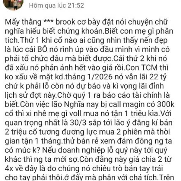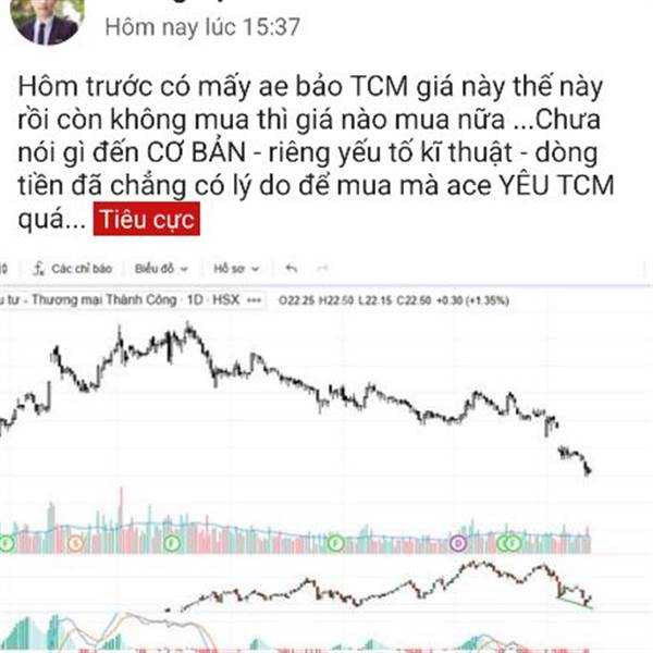 E ko có ý chê TCM đâu.Bản thân e cũng lõm đậm từ 3x về 26 cắt lỗ.Vừa rồi vào 22 lên 23 dc 3% thì ra hàng thì bõ bèn gì.Chả qua nó đánh láo lắm cầm hàng nhiều khi rất run.Nhất là tay to đăng kí bán nữa...Thêm