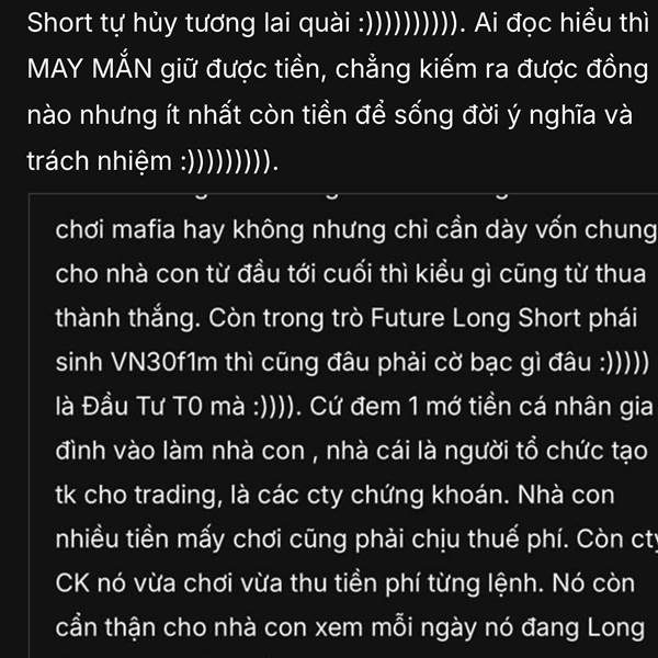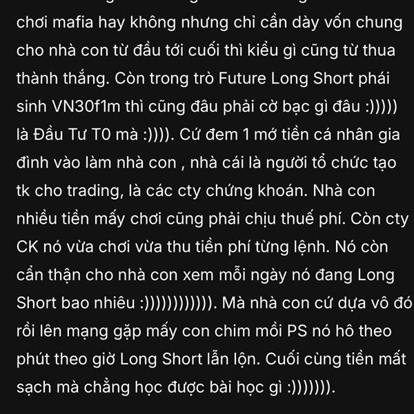 Khi vô 1 sòng bài. Thằng làm cái không cần biết có chơi mafia hay không nhưng chỉ cần dày vốn chung cho nhà con từ đầu tới cuối thì kiểu gì cũng từ thua thành thắng. Còn trong trò Future Long Short ph...Thêm