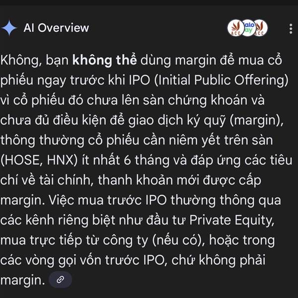 Các b cho m hỏi là cổ phiếc khác trước khi ipo có đc cấp margin để mua k vậy. Tại sao vck lại đc cấp mà tỉ lệ tại 1:1 để mua luôn. Theo quy định ubck là niêm yết phải 6 tháng mới xem xét đc cấp mà?