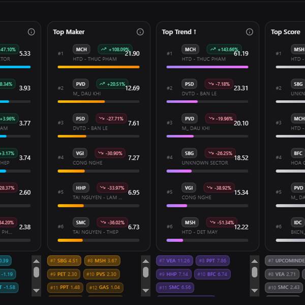 - Bộ lọc cổ phiếu nâng cao theo dòng tiền tổ chức (Maker) và nhỏ lẻ (Score).