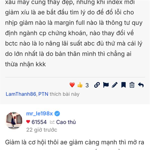 Có nói 1000 lần hay quay lại từ khi mới bắt đầu đầu tư từ thời F0 thì Lê vẫn nói và vẫn vậy chỉ có đổ vỡ chỉ có hoảng loạng càng hoảng loạn trong đống tro tàn thì cơ hội làm giàu càng rõ rệt. Tiếc là i...Thêm