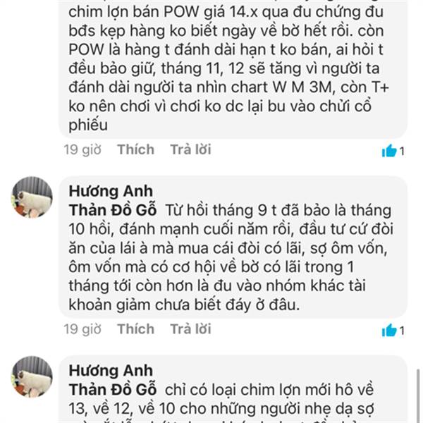 Nhỏ lẻ còn cầm hàng nhiều thì lái vẫn sẽ phải đánh cho ói ra hết , mình nghĩ POW còn sideway chán chê , tính bằng tháng , ae cứ canh dưới 14 loanh quanh 13,5-13,7 múc vào lướt lát , có lãi là bán luôn...Thêm