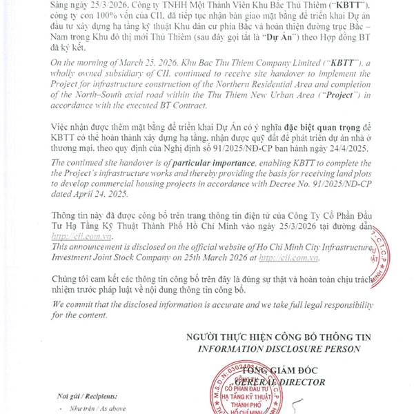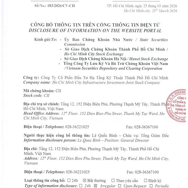 Công Ty Cổ Phần Đầu Tư Hạ Tầng Kỹ Thuật Thành Phố Hồ Chí Minh (“CII”) trân trọng thông báo đến Quý cổ đông: Ngày 26/3/2026, Ủy ban Nhân dân Thành phố Hồ Chí Minh đã ban hành Công văn số 2412/UBND-DA chấp thuận giao Liên danh Nhà đầu tư Công ty CII và Công …