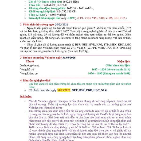 Tổng kết ngày 30/03/2026 và xu hướng ngày 31/03/2026