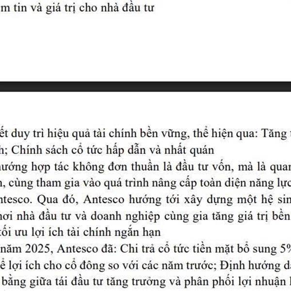 Cột mốc cao nhất trong lịch sử, năm 2024, Antesco ghi nhận doanh thu ròng 1.400 tỷ đồng, đóng góp 56 triệu USD kim ngạch xuất khẩu. 9 tháng năm 2025, doanh thu 1.450 tỷ đồng, tăng 45% so cùng kỳ; lợi ...Thêm