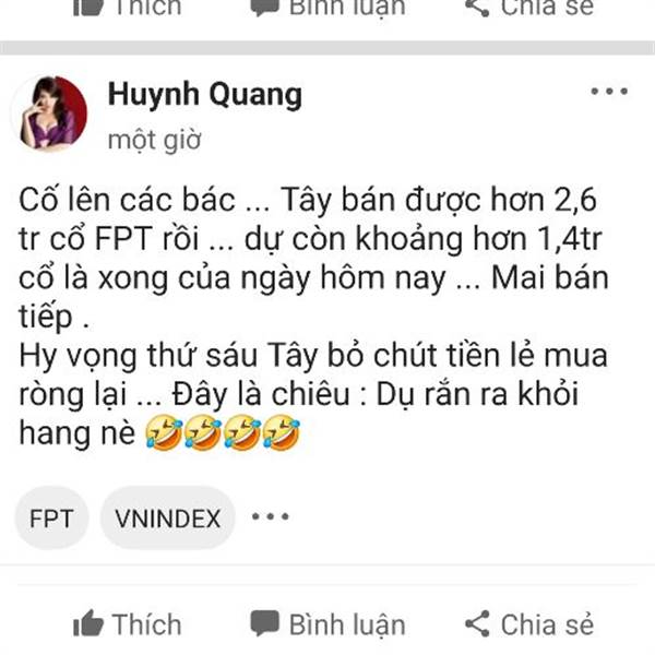 An tâm đi ... Tây vẫn còn đang nắm hơn 530 tr cổ FPT và chuyện bán ra kg phải 1 ngày 1 bữa ... Mua dụ cầu vào 1 chút rồi đạp nha ... dài dài tới cuối năm 2026 chắc cũng giảm nhiều nhiều à ... 🤣🤣🤣