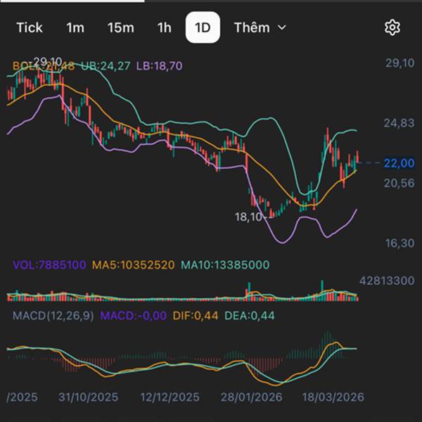 MACD cắt xuống r ae đu 22.8 hơi mát